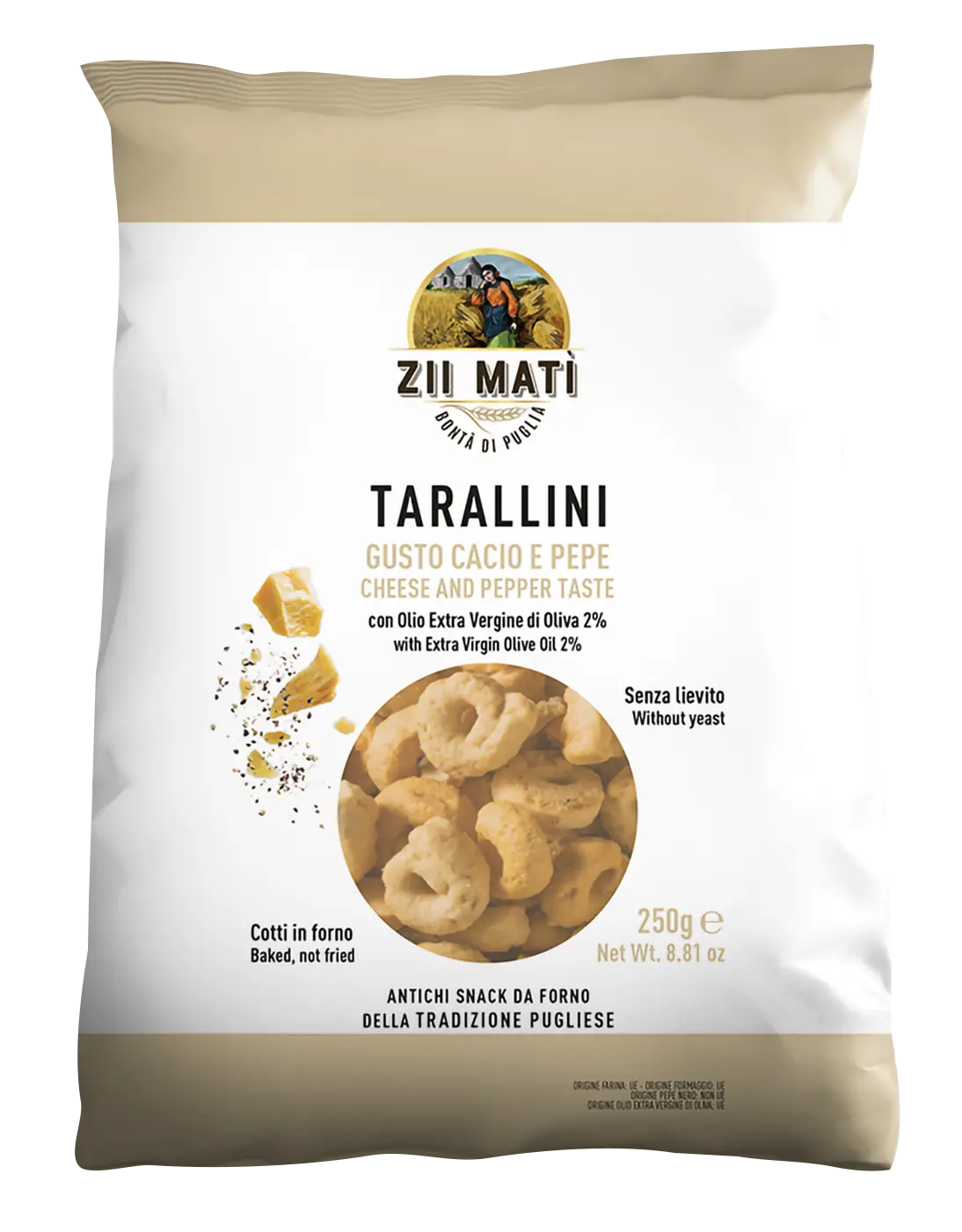 Tarallini Cheese and pepper taste are made following the typical traditional recipe, using raw materials characteristic of the Mediterranean diet, such as, extra virgin olive oil. They are characterized by a ring shape, a golden color and a distinctive flavor, enhanced by the flavor of extra virgin olive oil.